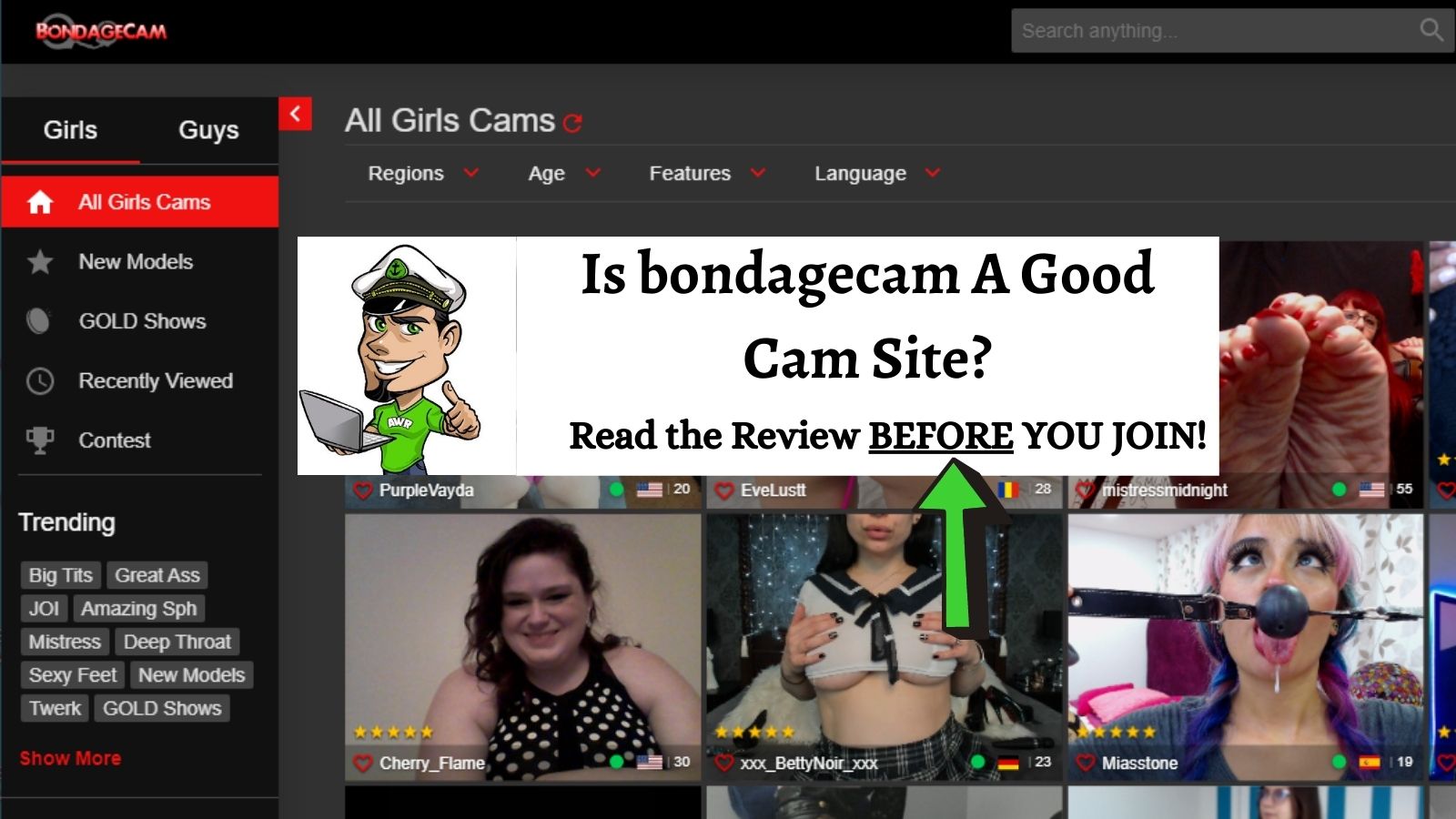 - Advanced Search: bondagecam.com also gives you the ability to choose which metrics you want to search by individually. Meaning you can search by age within any country or age, hair color, height as well as weight.